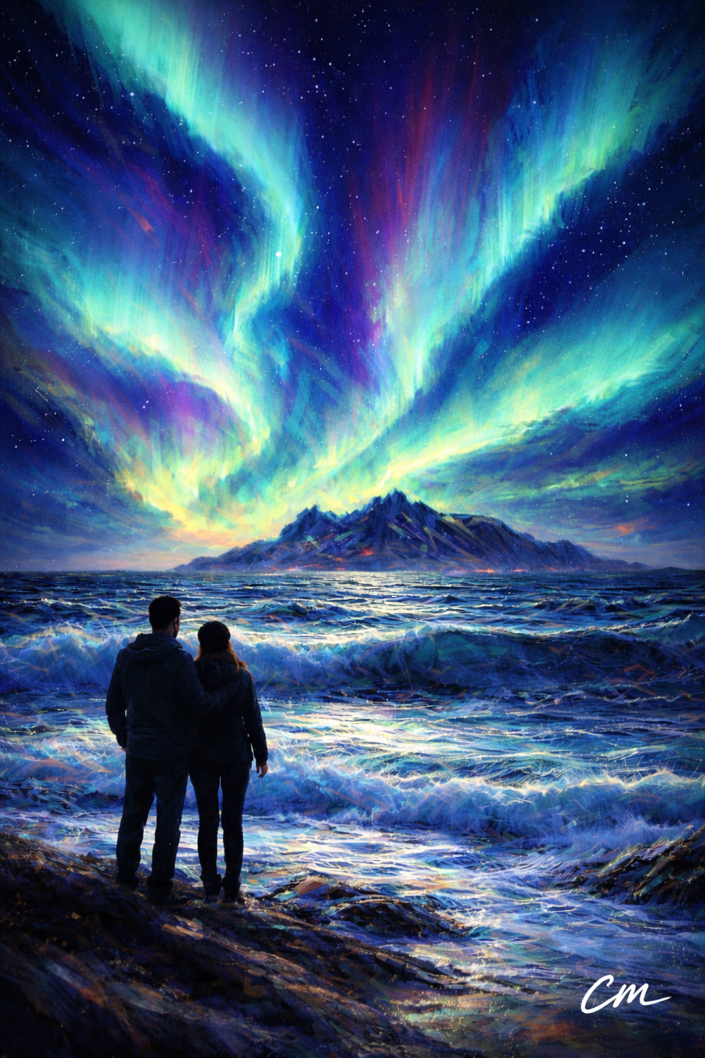 “Breathtaking” – is a digital abstract art painting. This painting conveys the colours you see during the Aurora Borealis in the sky. Viewed by a couple standing on the shore.