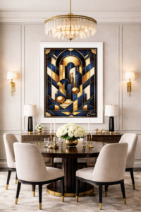 Inspired by the enduring appeal of geometric abstraction, the artwork explores the relationship between form, colour, and harmony. Circles, rectangles, and intersecting lines work together to guide the viewer’s eye through the composition, creating a sense of movement and structure.