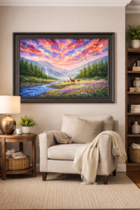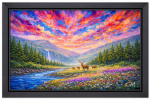“Deer in Glen” – is a digital abstract realism painting. This painting conveys the colours you associate with peace and harmony. It shows nature and wildlife that most people love to see.