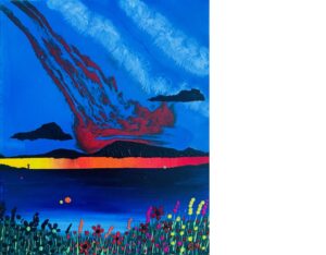 “Imminent” – is an abstract realism painting. This painting conveys a positive attitude towards the day ahead. Although the image shows rain clouds on the horizon, the day is bright and calm. The image is arranged to suggest an uplifting feeling, “Imminent” – The image and colour signify Trust, Loyalty and Freedom.