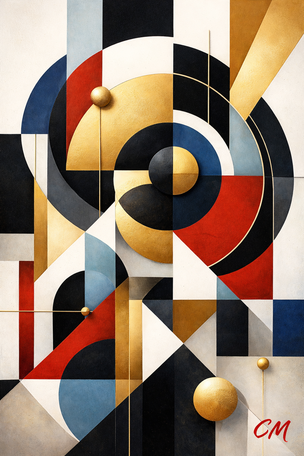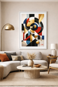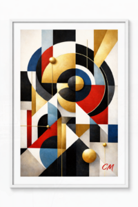 Inspired by the enduring appeal of geometric abstraction, the artwork explores the relationship between form, colour, and harmony. Circles, rectangles, and intersecting lines work together to guide the viewer’s eye through the composition, creating a sense of movement and structure.