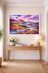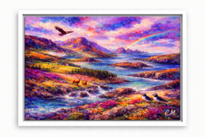 “Rugged” – is an abstract realism painting. This painting conveys a rugged landscape with beautiful colours that we all enjoy witnessing, especially in the late summer. It is a lovely place to spend some time.