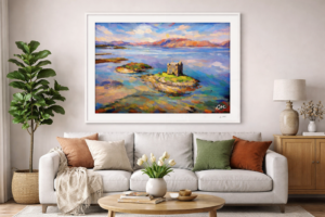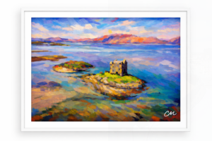 “Serene Surroundings” is an abstract realism painting. The painting is of a castle on an island in the Scottish Highlands. The bright colours give a sense of the beauty found around the loch. It is a lovely place to be.