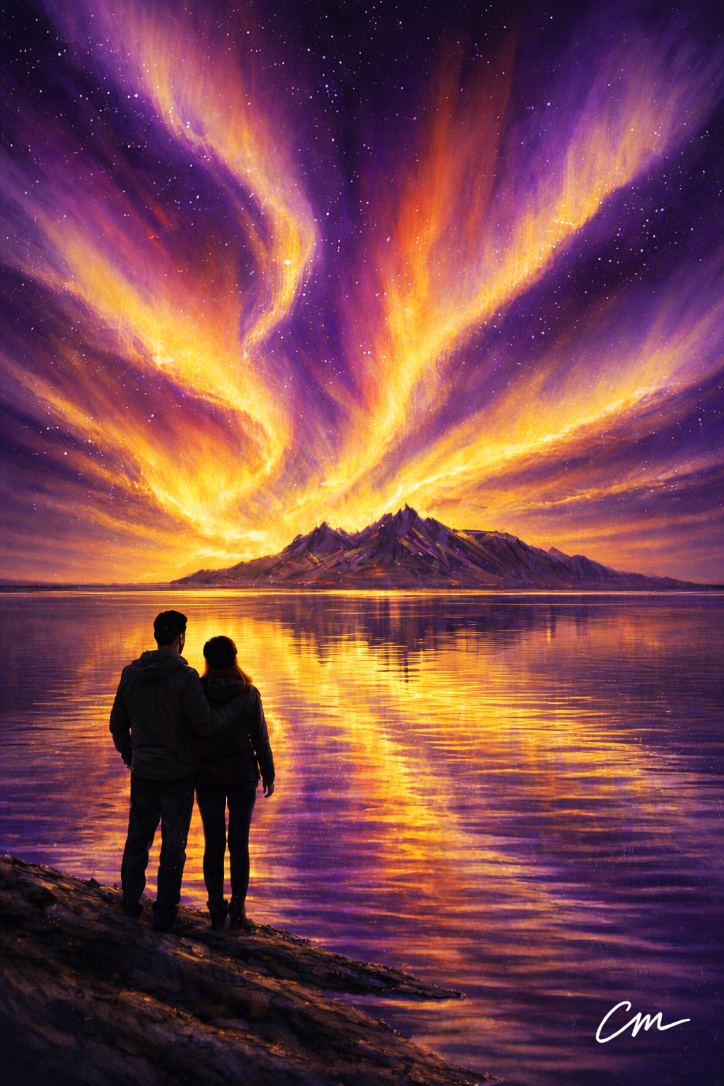 “Speechless” – is a digital abstract art painting. This painting conveys the colours you see during the Aurora Borealis in the sky. The sky merges with the sea and envelops the island in this dramatic scene. Viewed on a calm night, by a couple standing on the shore.
