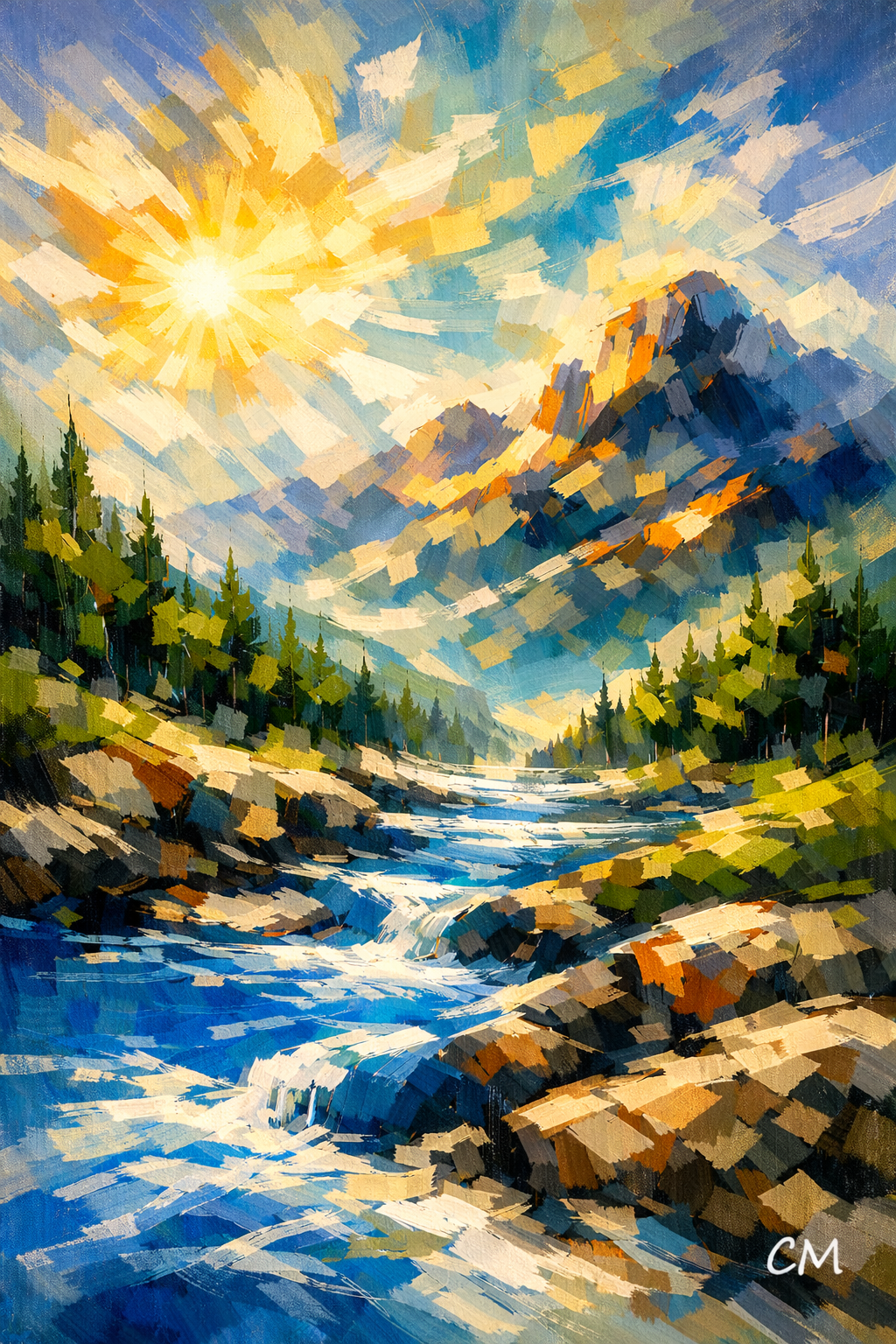 “Summer Stream” – is an abstract realism painting. This painting conveys a stream in the Highlands, flowing through a Scottish glen in the sumer months. It is a lovely place to spend some time.