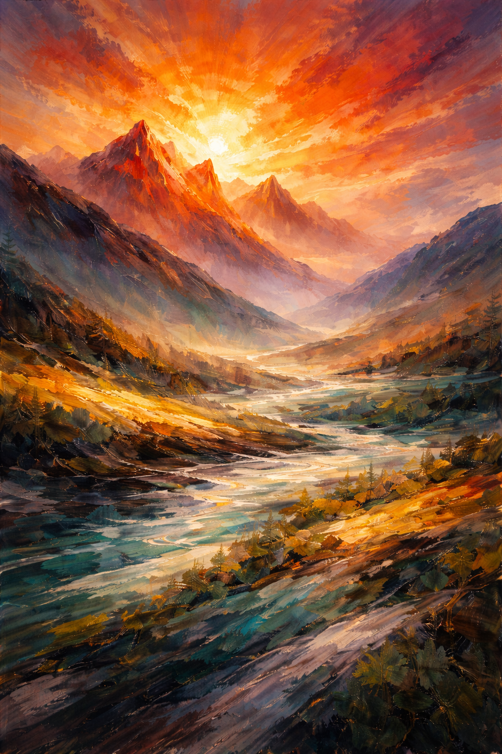 “Sunset Glen” – is a digital abstract art painting. This painting conveys through the various colours a sunset in a Scottish glen (valley). The colours are those seen within nature as the sun sets over the landscape.